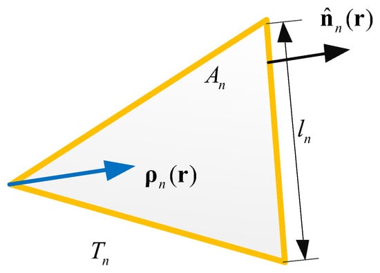 where, refers to the triangle of the n-th half RWG basis function, refers to the area of the triangle, refers to the vector that the triangle node points to the point inside the triangle, refers to the side length, and refers to the normal vector pointing out of .