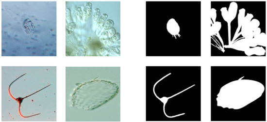 The direct visual identification of EMs is an impossible task because they have small sizes that range from 0.1 to 100 microns. To solve this issue, auxiliary equipment and technologies are often employed, with microscopy being one of the most common identification techniques [2]. However, microscope image recognition is usually performed manually and is time-consuming. Moreover, outlining EMs, that is, EM image segmentation, is also a huge challenge because they often blend in with their surroundings and have a similar visual appearance. Figure 1 shows the microscopic imaging of multiple EMs and the results of artificial segmentation. In this study, we aimed to automatically segment environmental microorganisms using microscopic imaging based on computer vision technology.