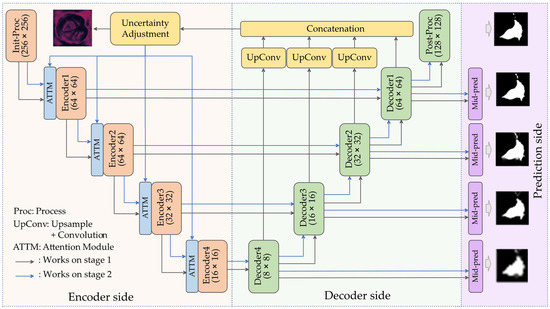 - A new network structure based on an encoder–decoder architecture is proposed. The network integrates two-stage processing, uncertainty feedback, attention, and a mid-pred module, thereby enhancing the segmentation accuracy.