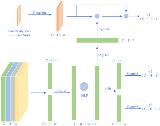 The two channels of information are then concatenated as a (C × (H + W) × 1) vector. The feature map was then sent to a multilayer perception function to extract the importance of each row and column, which affected a single pixel when considered together. This function generates another vector, (C × (H + W) × 1). The vector is sent in two directions: it is applied with average pooling, forming a C × 1 × 1 vector y1 that indicates how the residual mask should be emphasized on the channel. It is also split into a C × H × 1 vector y2 and a C × 1 × 2 vector y3, which shows the positional interest of each pixel.