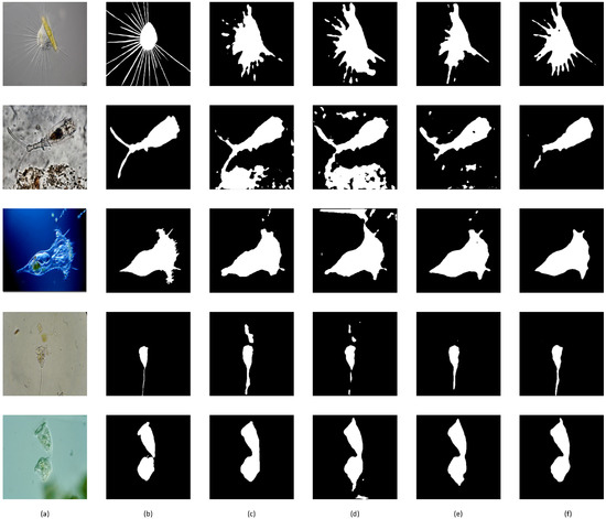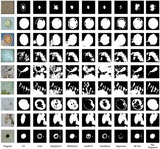 These studies achieved satisfactory results for EM image segmentation. However, most studies have focused on certain types of microorganisms; therefore, they lack versatility in dealing with various types of EMs. Furthermore, in EM segmentation tasks, the transparency of the foreground and uncertainty of the EM position may still cause mispredictions, which remains a difficult problem. As a result, though the newest networks often achieve the best results on most tasks, they might show problems when dealing with EM images. For example, although transformer-based networks perform well for many types of segmentation tasks, they require a large amount of computation before being transferred to a certain task. In contrast to large datasets, such as ADE20K [36], which has thousands of pictures, EMDS-6 [37] (which we used) has only 420 original images for segmentation. Furthermore, blurry edges and transparent insides remain challenging to the network. Therefore, there is still much scope for optimizing segmentation models. In the visual comparison in Section 4.4, we can observe the limitations of previous segmentation methods when faced with different types of EMs.