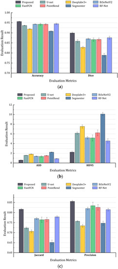 Note that, for accuracy, Dice, Jaccard, recall, and precision, a higher value indicates better results, whereas for ASD and HD95, a lower value indicates better results. The equations for these metrics are presented in Table 2.