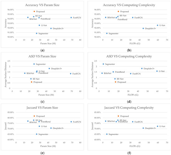 Performance requirements versus segmentation capabilities. (a) accuracy versus param size; (b) accuracy versus computing complexity; (c) ASD versus param size; (d) ASD versus computing complexity; (e) Jaccard score versus param size; (f) Jaccard score computing complexity.