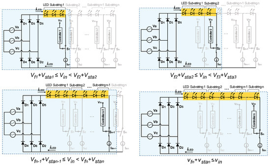 The specific operation of this circuit is illustrated in Figure 2 and can be described as follows: the n constant current sources are turned on or off in sequence with the ripple of Vin. If Vf[k−1] + Vsat[k−1] ≤ Vin < Vf[k] + Vsat[k] (k = 1, 2, …, n), Is[k−1] (k = 1, 2, …, n) will be turned on sequentially, and other constant current sources will be turned off; if Vin ≥ Vfn + Vsatn, Isn, will be turned on and if Vin < Vfn + Vsatn, Isn will be turned off. It is similar to the linear multi-string GaN LED driving principle for single-phase AC power in Ref. [14].
