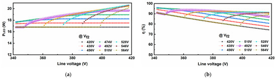 Figure 4b shows the η of the double-string LED with different Vf2 values. At 420 V ≤ Vf2 < 492 V, η gradually decreases with the increase of line voltage. Similar to the trend of PLED, the breakpoint also appears at Vf2 ≥ 492 V. Overall, PLED and η are obviously impacted by line voltage fluctuations. PLED remains stable with the decrease of η at small Vf2, while PLED fluctuates significantly with the increase of η at high Vf2. Therefore, it isn’t easy to select Vf2 intuitively.