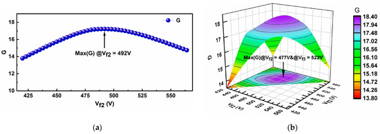 Figure 5b shows the three-dimensional surface of G with different Vf2 and Vf3. The maximum G is calculated at Vf2 = 477 V and Vf3 = 522 V, and the corresponding calculated η is 93% (@420V line voltage)–96% (@387V line voltage). A comparison of single-, double- and triple-string LED driving schemes reveals that η increases with the number of GaN LED sub-strings.
