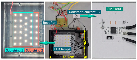 A double-string GaN LED lighting system linearly driven by three-phase power with pulsating DC was constructed as a module prototype and tested for driving efficiency, harmonic current, and flicker, as shown in Figure 6. Twenty-nine GaN LED lamps were mounted on the printed circuit board (PCB). The forward voltage of each GaN LED lamp used in the experiment is 18 V. For continuous operation of the first LED sub-string to alleviate flicker, the number of LED lamps in the first sub-string was chosen to be 23, corresponding to Vf1 = 414 V, a little lower than the minimum input voltage of 420 V. The linear constant current regulator IC chip with dual-channel, named SM2186E, provided by Shenzhen Sunmoon Microelectronics Co., LTD [15], was used to control the turn-on and turn-off of the double-string GaN LED with a constant current of 40 mA.