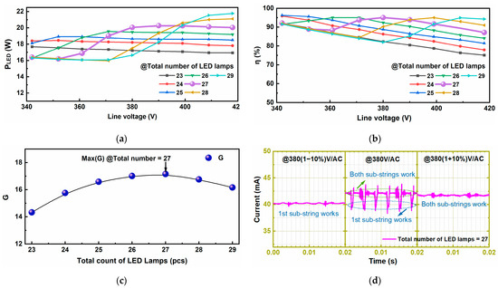 Figure 7a,b show the experimental results of PLED and η under 380 V ± 10% line voltage, respectively. The experimental results are essentially consistent with the calculations. PLED of the module prototype is 16–22 W, corresponding to a very low driving cost of $0.005/W. At 380 V line voltage, both PLED and η increase firstly and then decrease with the rise of the total number of GaN LED lamps and the maximum η (~94%) is achieved when there are 23 GaN LED lamps in the first sub-string and 4 GaN LED lamps in the second sub-string.