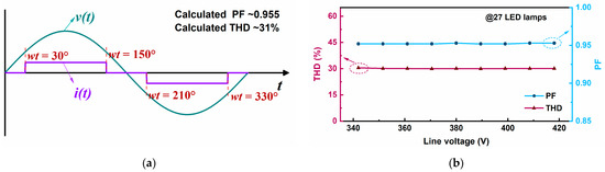 Figure 8a shows the voltage waveform v(t) and current waveform i(t) of each AC phase in the linear GaN LED driving scheme. Based on the voltage waveform v(t) and current waveform i(t), PF is calculated by its definition to be 0.955, and THD is calculated as 31% by the Fourier series on current waveform i(t) [16]. Furthermore, Figure 8b shows the PF and THD of the module prototype with a total number of 27 GaN LEDs under 380 V ± 10% line voltage. It can be seen that PF is maintained near 0.952 and THD is about 31%, meeting the requirement of ENERGY STAR [17]. Experimental results agree with theoretical calculations in Figure 8a.