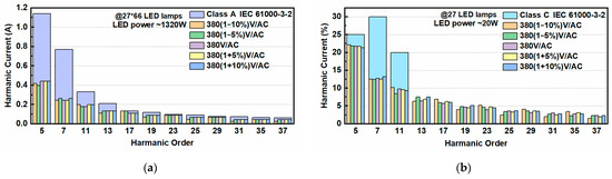 On the other side, GaN LEDs are also lighting equipment, limited by the most restrictive regulation for IEC 61000-3-2 Class C. Figure 9b shows the corresponding harmonic currents expressed as a percentage of the fundamental current under 380 V ± 10% line voltage. The harmonic currents at 20 W GaN LED power also meet the requirements of Class C because when the rated power < 25 W, Class C only limits the fifth, seventh, and 11th harmonic currents. However, when the rated power > 25 W, e.g., 66 module prototypes connected in parallel, its 5th–37th harmonic current will exceed the Class C requirement.