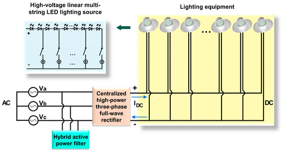 For high-power lighting equipment, one optimal solution was considered to meet Class C, in which a centralized high-power three-phase full-wave rectifier was used to produce pulsating DC power. As shown in Figure 10, many pieces of lighting equipment are installed along electric lines. Both lines flow constant current. There are no problems with electromagnetic interference (EMI) along these lines. And the hybrid active power filter (HAPF) is assembled for centralized harmonic suppression in the busbar [19]. Compared with the common solution that each GaN LED driving topology includes electromagnetic compatibility, rectification, power factor correction, filtering, inverter step-down, voltage stabilization, etc., this optimal solution with fewer driving components and higher reliability is more suitable for road and tunnel lighting projects with harsh environmental conditions.