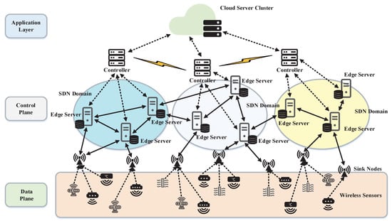 In this paper, computing resources are allocated on-demand through a software-defined architecture, with the aim of enabling multiple edge servers to work together on tasks in a highly automated and intelligent manner. Software-defined edge computing as an open IoT system architecture decouples upper-layer IoT applications from the underlying physical resources at the edge and builds dynamically reconfigurable intelligent edge services [5]. The advantage of this new architecture is the ability to achieve logical and centralised control of distributed network nodes as well as IoT devices. SDN has been extensively studied in terms of controller deployment in software definition [6,7], controller scalability [8] and SDN applications [9]. However, to our knowledge, collaborative processing of edge-computing tasks in the IoT environment has been rarely addressed. To this end, this paper proposes a software-defined edge-based architecture, which allows the controller to collect information from edge servers and sense the network state from a global perspective by separating the control plane from the data plane. Based on the decisions made by the SDN controller after sensing, it determines whether the current task is to be executed on the current edge server or whether some or all of the tasks are to be distributed to other edge servers for coprocessing.