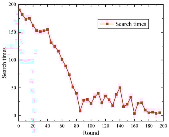 When running the RL-SDETA algorithm, as the number of training rounds continued to increase, it could be found that the number of times the optimal edge server was modified in the process of finding the optimal value decreased rapidly, and as the number of training rounds increased to a certain level, the number of times the optimal edge server was found stabilised at a low value. As shown in Figure 3, the number of lookups for the optimal value was always maintained at a low level as the feedback algorithm continued to operate.