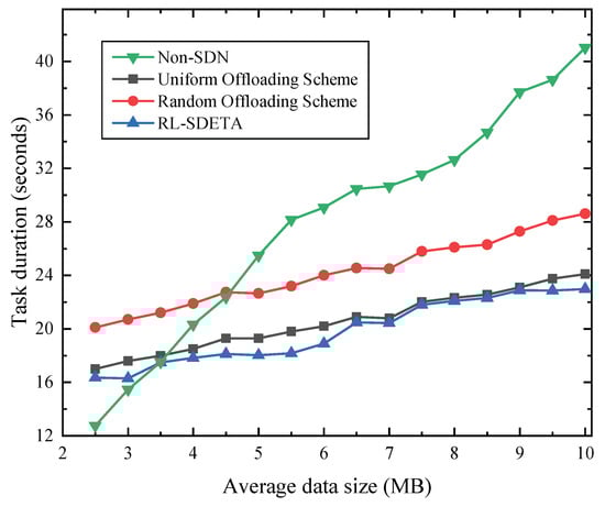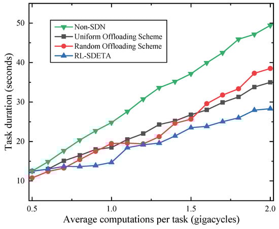 According to Figure 5, we can conclude that the larger the computational and data volume of the computational task, the longer the task duration. Our proposed RL-SDETA algorithm had a shorter task duration compared to the other two schemes. This was because the RL-SDETA algorithm was implemented to minimise the task duration by considering the task computation and data volume, the computational capacity of the server and the remaining computational resources. In addition, we found that the global optimisation effect of the SDN was not obvious when the task data volume was small, but as the task data volume increased, network optimisation through the SDN became necessary. This was because the SDN architecture could optimise the network congestion level when the task data volume was relatively large, and the RL-SDETA algorithm could even take the task data volume size into account in the edge server selection process.