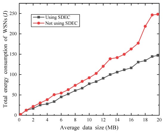 By modifying the size of the average data volume, we found that the total energy consumption of the entire wireless sensing network increased as the quantity of data to be transmitted increased, which confirmed that the transmission energy consumption in a wireless sensing network is not only related to the transmission distance but also to the size of the transmitted data volume.