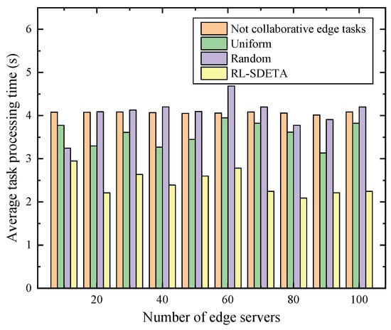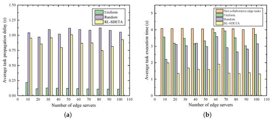 Firstly, as shown in Figure 7a, different task allocation strategies differed in their average task propagation delay under different numbers of edge servers. For example, if there was no edge collaboration, then there was no need to consider the propagation delay among edge servers; while the uniform task-offloading scheme only collaborated with the nearest edge server to process tasks and uniformly sent a portion of the edge tasks to the nearest edge server. Therefore, the propagation delay of these two schemes was the lowest. In comparison with the random task offloading scheme, the RL-SDETA algorithm had a clear advantage for the propagation delay. In the case of a large number of edge servers, the RL-SDETA algorithm considered each edge server comprehensively and selected the optimal edge server.