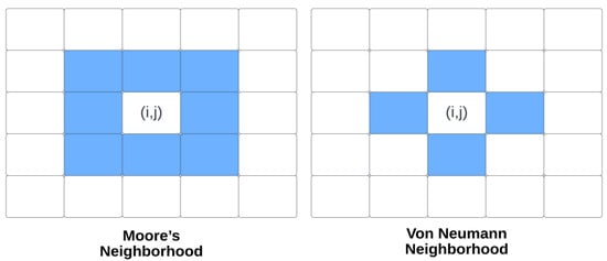 As described in (7) transition function requires states of neighboring cells for determination of state of subject cell in subsequent generation of lattice. Most common neighborhood configurations are Von Neumann and Moore neighborhood schemes [31]. In Von Neumann Neighborhood scheme (denoted as ) neighboring cells are adjacent cells in four cardinal directions (Figure 1). Given a radius neighborhood range can be extended, with that a cell at coordinate neighbors a cell at coordinate in Von Neumann configuration if it satisfies the following rule: