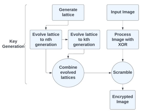Lattice is evolved to generation, then generation lattice is combined with one of previous generation which is named generation. This new combined lattice is scrambling lattice that is used to scramble image pixels. The steps for scrambling algorithm are elaborated in Algorithm 3 and an abstractive illustration of the proposed scheme in on Figure 3.