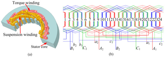 Figure 2a shows the structure of the stator. The stator is composed of the stator core and two windings. The stator core is formed by laminating 0.5 mm silicon steel sheets, and 24 slots are opened on the stator core in the designed motor. The slots of the stator core are embedded with torque winding and suspension force winding to provide torque and suspension force for the composite cage rotor, respectively. The torque winding and suspension force winding are placed at the bottom and top of the stator core, respectively. In the proposed motor, two windings are distributed in a single-layer concentric circle, and the torque winding and suspension force winding are powered by a high-voltage power supply and low-voltage power supply, respectively. The number of pole-pairs of the torque winding is 1, and the number of pole-pairs of the suspension force winding is 2. Figure 2b shows the distribution of torque winding and suspension force winding.