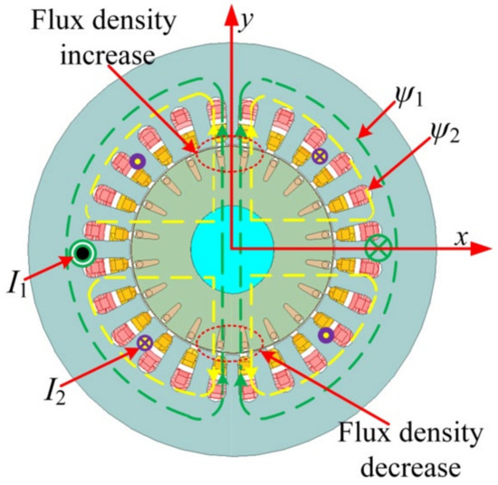 According to the basic principle of the bearingless motor, when the relationship between the number of pole-pairs of the torque winding and the suspension force winding is ±1, and the magnetic field rotation direction and electrical angular frequency of the two windings are consistent, the rotor will achieve stable suspension [13]. When the currents are injected into the two windings simultaneously, the magnetic field balance is destroyed, and the composite cage rotor will be subjected to Maxwell force in one direction in the unbalanced magnetic field. The direction of the radial force is changed by adjusting the initial phase angle difference between the torque winding current and suspension winding current. By setting the optimal initial phase angle difference, the radial force along the y-axis is obtained to realize the stable suspension of the composite cage rotor. The suspension mechanism is shown in Figure 3 [14].