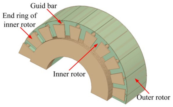 The two symmetrical guide bars and two end rings of the inner rotor form a special guide bar set (SPBS) through a closed connection, as shown in Figure 5a. Ten SPBSs are insulated from each other to form a special squirrel cage rotor structure, as shown in Figure 5b. This rotor structure of the inner rotor only senses the torque winding (P1 = 1). The induction mechanism is analyzed in Equations (1) and (2). The traditional BIM adopts a squirrel cage rotor structure; when the torque winding (P1 = 1) and suspension force winding (P2 = 2) work at the same time, both windings can induce rotor current. However, the squirrel cage rotor current induced by the suspension force winding will interfere with the torque, and the squirrel cage rotor current will also interfere with the rotor suspension. To overcome this problem, the special squirrel cage rotor structure of the inner rotor with induction only to the torque winding is designed.