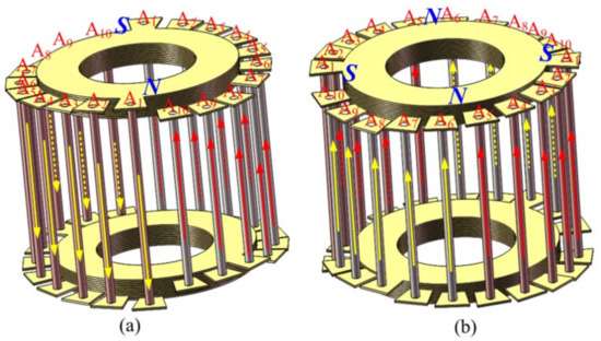 According to Equation (2), for the torque winding magnetic field (P1 = 1), the two directions of the induced electromotive force at the point x1, x2 are opposite to form a loop. For the suspension force winding magnetic field (P2 = 2), the induced electromotive force at the point x1, x2 has the same direction and cancels each other. The induced current distribution of torque and suspension force winding in the special squirrel cage rotor structure is shown in Figure 6. That is, there is only the induced current of torque winding in the guide bars.