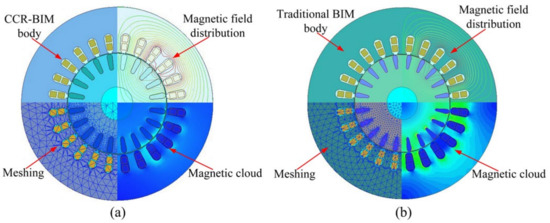 The performance of the two motors is simulated with FEM. Figure 8 shows the structure and characteristic distribution of the two motors. The main parameters of the CCR-BIM and traditional BIM are listed in Table 1.