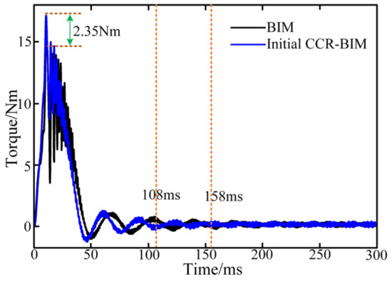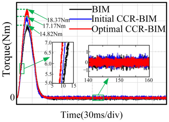 Figure 9 shows the torque characteristics between the CCR-BIM and the traditional BIM. In the start-up stage, the starting torque of the CCR-BIM reaches 17.31 Nm, while the starting torque of the BIM is 14.96 Nm. The torque of the CCR-BIM reaches a stable operation state in 108 ms, while the torque of the BIM needs 158 ms to reach stability. In the stable operation stage of the motor, the torque of CCR-BIM is more stable.
