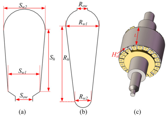 Optimized parameters of the stator and rotor. (a) Stator slot parameters; (b) Rotor slot parameters; (c) Rotor parameters.