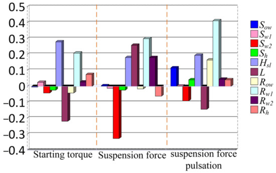 The sensitivity analysis of the stator and rotor parameters for the motor performance is shown in Figure 13. According to the comparative analysis in Figure 13, Sw2 has a great impact on the suspension force, L has a great impact on the starting torque and suspension force pulsation, and Hsl and Rw1 have the greatest impact on the three optimization objectives. Therefore, these four parameters are set as the optimized parameters. The influence of the other parameters is too little so can be ignored.
