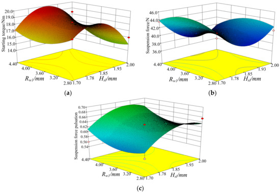 RSM based on sensitive parameters. (a) Starting torque; (b) Suspension force; (c) Suspension force pulsation.
