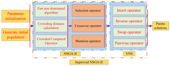 The algorithm has a high probability of falling into the local optimum. Therefore, a variable neighborhood search (VNS) algorithm is introduced in the NSGA-II algorithm. By introducing the inverse operator and the pairwise operator, some gene sequences of the current solution are changed to generate a neighborhood feasible solution set so as to avoid the solution generated in the process of population evolution from falling into the local optimum. An improved NSGA-II algorithm is designed.