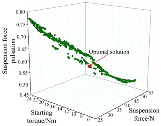 The Pareto solution set and optimal solution are shown in Figure 20. The optimum value of the corresponding sensitive parameters is Rw1 = 3.61 mm, Hsl = 1.97 mm, L = 82.85 mm, and Sw2 = 5.84 mm. The starting torque is 18.4 Nm, the suspension force is 43.26 N, and the suspension force pulsation is 0.53 when the motor runs stably. Compared with the before-optimization state in Figure 9 and Figure 10, the starting torque has increased by 6.29%, the suspension force has increased by 6.36%, the suspension force pulsation has been reduced by 14.51%, and the performance of the CCR-BIM has been effectively improved (as shown in Table 3).
