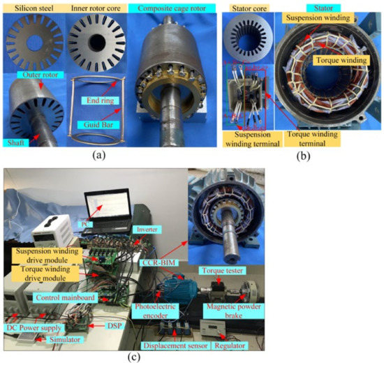 To verify the correctness of the motor structure and designed optimization strategy, the composite cage rotor and experimental prototypes are manufactured based on the initial and optimal parameters. In addition, the traditional BIM is also involved in the comparison, and the performance of the three motors is compared. The experimental platform is shown in Figure 21. Figure 21a and Figure 21b show the composite cage rotor structure and stator structure, respectively. Figure 21c shows the motor test bench, which mainly consists of the prototype, DSP, photoelectric encoder, displacement sensor, inverter, torque tester, and so on.