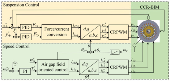 The air gap field-oriented control is applied to the motor test bench [24,25]. The CCR-BIM control system is composed of the speed control system and the suspension control system. Because the CCR-BIM has the double-winding structure, and there is a coupling phenomenon, the air gap field-oriented control strategy is adopted to realize the decoupling of the control system. The speed and displacement fed back by the motor are used to control the two systems separately through PID. Figure 22 shows the control system.