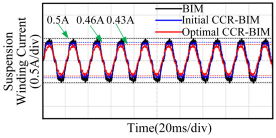 Figure 24 shows the current waveform of suspension force winding A. The suspension force cannot be measured directly on the experimental platform. However, when the rotor mass of the motor is certain, by adjusting the current of the suspension force winding, the suspension force can be indirectly reflected by the current of the suspension force winding when the motor is stably suspended. I1 represents torque winding current, and I2 represents suspension winding current. The suspension force winding current I2 of the optimal CCR-BIM is 0.43 A, the suspension force winding current I2 of the initial CCR-BIM is 0.46 A, and the suspension force winding current of the BIM is 0.5 A. When the rotor weight is equal, the suspension current of the CCR-BIM decreases. Compared with the current waveform of the suspension force winding of the optimal CCR-BIM, the initial CCR-BIM, and the traditional BIM, the suspension force winding current of the optimal CCR-BIM is smoother. It is proved that the suspension force and suspension quality of the CCR-BIM have been improved.