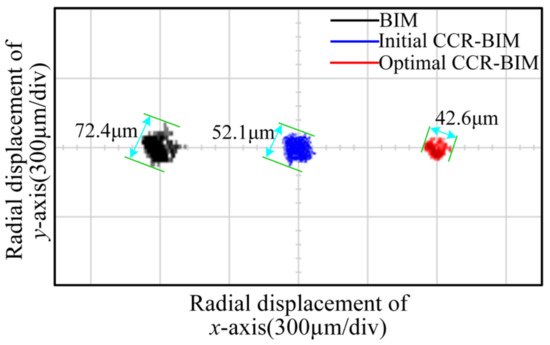 The suspension pulsation cannot be measured directly through the experimental platform, which is reflected by the x-axis radial displacement and the trajectory at the end of the rotating shaft. Figure 25 shows the trajectory at the end of the rotating shaft of the three motors, which can show the performance of the suspension force pulsation. The maximum fluctuation amplitude is marked as Dmax, which is the result of the interaction between the x-axis radial displacement and the y-axis radial displacement. Through comprehensive calculation, the Dmax of the BIM is 72.4 μm, the Dmax of the initial CCR-BIM is 52.1 μm, and the Dmax of the optimal CCR-BIM is 43.1 μm. The trajectory at the end of the rotating shaft of the optimal CCR-BIM is smaller, which reduces the radial offset in any direction and improves the suspension quality.