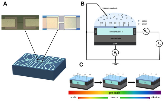The pH value affects the surface charge and, thus, the characteristics of the sensors. The silicon surface of the biosensor is covered by a thin layer of silicon oxide. After surface oxidation, the silicon hydroxide is formed on its surface. Protonation of silanol groups occurs in an acidic environment, and their deprotonation is under an alkaline environment (Figure 1C) since the pKa for silanol groups (SiOH) on the surface is 4.5 to 8.5 [25,26]. However, S. Zafar et al. report that the pH sensitivity of nanowires is independent of the buffer solution concentration and that the mechanism of nanowires sensing in ionic solution is complicated [27]. The pH values may change during the biochemical analysis [28]. Consequently, the analysis conditions, including pH values, have a significant impact on both the state of the sensor and the efficiency of its interaction with the molecule. It is important to select the pH value or range in which this influence will be minimal. The measurement scheme depends on the pH value [24]. In the pH sensitivity of sensors, as a rule, an electrode placed in an electrolyte (reference electrode, RE, Figure 1B) is used as a control gate [8,27]. To prevent the charge of biomolecule changes at the detection, the conductivity is typically controlled by the voltage on the SOI substrate (i.e., back-gate (BG) SOI-FET sensor). In this case, the RE is grounded [24,29,30,31,32,33,34]. The bottom gate scheme showed a very high sensitivity of the silicon nanowire-based pH sensor, reaching 1.4 V/pH [24].