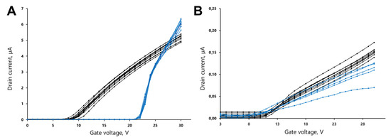 The average value of the threshold voltage measured in air was 8.66 ± 0.76 V. When the sensor elements are placed in the water, the current values for the different wires almost completely repeat each other in the whole gate voltage range (Figure 2A, blue lines). The maximum value of RMSD in a series of measurements in air and water differs 2.7 times. The average value of the threshold voltage measured in water was 20.7 ± 0.28 V. In general, the repeatability of measurements in water for different wires is better than in air, and they have the same type of volt-ampere characteristics.