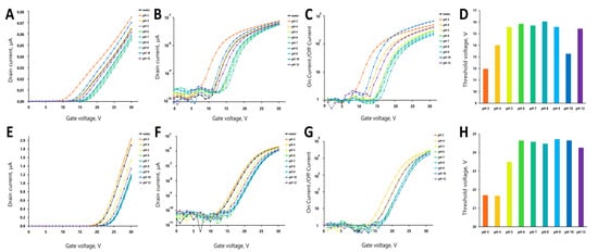 The drain-gate characteristics analysis of the sensors as a function of solution pH (200 mM sodium acetate). (A–D) characteristics for 0.2 µm SOI-transistor; (E–H) for 3 µm SOI-transistor. (A,E,B,F) are drain-gate characteristics of a single wire over the entire range of solution pH values in linear and logarithmic scales. (C,G) “On” current to “off” current ratio curves. (D,H) The dependence of threshold voltage on the pH.