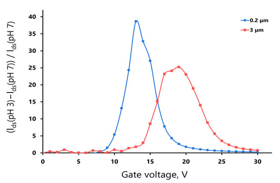 This dependence shows the way to select the optimal gain voltage for the measurements of wire conductivity by varying any factor affecting it. In our case, it was changed in pH value. The values of the current changes for different pH values strongly depend on the Vg selected, reaching the relative change values of 35 and 29 at gate voltage 13 and 19 V for 0.2 μm and 3 μm sensors, respectively. For our sensors, such voltages corresponded to the highest sensitivity to the pH changes.