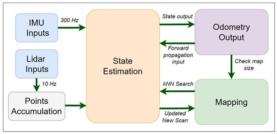 FAST-LIO2 [13] is a tightly coupled direct-based LiDAR-inertial SLAM algorithm. Unlike feature-based LiDAR SLAM algorithms, which extract edge and planar features from the LiDAR data, FAST-LIO2 directly uses the LiDAR point-cloud data. This facilitates less computational power requirements and time consumption owing to the exclusion of the LiDAR data preprocessing step. However, the direct use of raw data causes the scan matching process to be computationally heavy. To solve this issue, Wei Xu et al. created a new lightweight Kalman gain calculation formula that allows for performing a scan matching function using the raw LiDAR points directly while consuming low computational power. Additionally, an incremental k-d tree structure is employed to perform the mapping process. Moreover, the use of two parallel nodes allows for the incremental updates and dynamic rebalancing of the k-d tree structure to simultaneously occur. Figure 1 shows a simplified system overview diagram.
