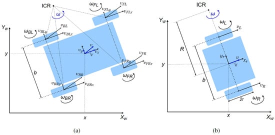 where and are the sum of angular velocities of the wheels on the left and right side, respectively. Expressing the robot’s linear and angular velocity in terms of the wheel’s linear velocity, we have