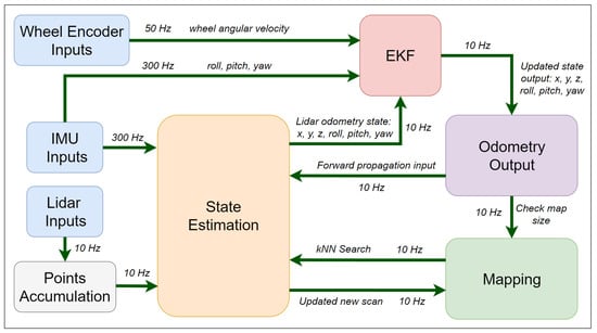 EKF-LOAM [23] is another work that incorporates wheel odometry information, which employs LeGO-LOAM as the base algorithm and improves its odometry estimation by fusing LiDAR, IMU, and wheel encoder data into an EKF. As the wheel encoder information is obtained at a lower rate of 20 Hz, only IMU information is used for the pre-integration process. LiDAR odometry is estimated after the features are extracted from the LiDAR information. Usually, in the LiDAR SLAM pipeline, the LiDAR odometry information is sent to the optimization part of the algorithm for the mapping and pose estimation processes. However, in EKF-LOAM, the LiDAR odometry information is sent to an extended Kalman filter that fuses it with IMU and encoder data; the skid steering kinematic model is employed to obtain the wheel odometry information [24].