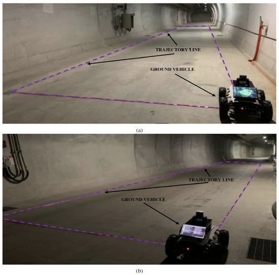 For our experiments in the tunnel environment, we utilized a four-wheeled skid steering AGV. Figure 4 shows the vehicle’s configuration. The robot provides odometry data from wheel encoders at a frequency of 50 Hz; it is additionally equipped with 3D LiDAR and IMU sensors running at 10 and 300 Hz, respectively. The ground vehicle runs with a maximum speed of 1.5 m/s and has a maximum payload of 50 kg. Being powered by a 24 V 30 Ah battery, it can run for 4 h. Additionally, an onboard Jetson single-board computer is installed on the vehicle, which communicates using the controller area network interface.