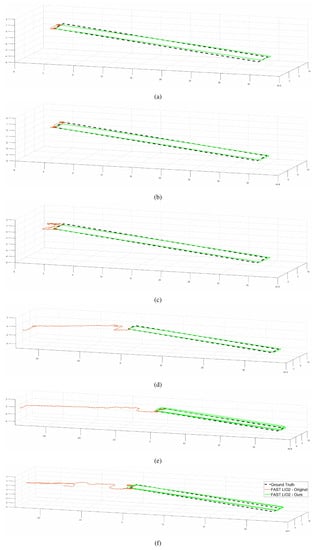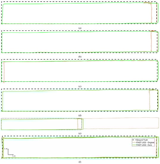 When comparing the generated paths in the inclined section with those in the flat section, we can observe that the performance of the original FAST-LIO2 is much worse in the inclined section (no generated path is close to the ground truth). The estimated trajectory is relatively good only in the y global direction. In contrast, our modified FAST-LIO2 algorithm generates paths that are close to the ground truth in all six experiment runs. Moreover, the elevation information of the trajectory is estimated well. Compared to the results, the results show a better understanding of the trajectory error throughout the whole paths. Specifically, from the estimated trajectories in Figure 8d,e we can see that the original FAST-LIO2 algorithm outputs a lower trajectory error in the latter part of the trajectory run compared to that of the other part.
