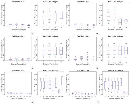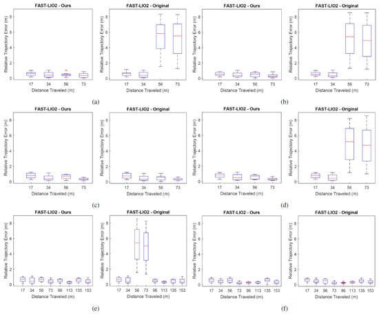 This section presents the results obtained from the experiment in the flat terrain section of the tunnel. Figure 6 depicts the estimated single-loop trajectories from the original and modified FAST-LIO2, where trajectories a–d and e–f represent the single-loop and double-loop experiment runs, respectively. Table 1 presents the results; Figure 7 depicts the results as quartiles. The shown in Figure 7a corresponds with the path displayed in Figure 6a and so on.