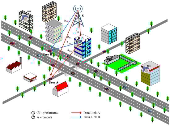 where P represents the transmission power at S, and are the data symbols with , represents the phase shift matrix of the RIS to serve A, represents lossless reflection, represents the phase shift caused by the i-th element for , represents the phase shift matrix of the RIS to serve B, means the phase shift reflected by the j-th element for , and the additive white Gaussian noise (AWGN) at A and B is with zero mean and variance .