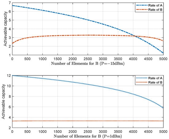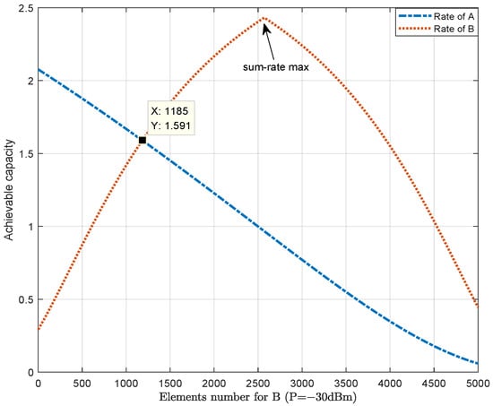 Figure 2 shows the achievable capacity versus the number of reflecting elements allocated for user B. In our proposed system, the transmission power is set as P = −30 dBm, and the number of elements is fixed at 5000. Clearly, a greater number of reflective elements of an RIS assigned to a user leads to better channel quality. In this paper, the simulation assumes that the initial state has not assigned RIS elements to user B, resulting in poor channel quality, and hence user B has a lower capacity. With an increase in the number of reflecting elements allocated to user B, the channel quality improves, and the corresponding data rate gradually increases. As the number of reflective antennas assigned to user A by the RIS decreases, the achievable capacity at A gradually decreases, while the achievable capacity for B increases first and then decreases. There is a rate intersection between A and B, where represented transmission rates for the two channels are equal. Then, with an increase in the number allocated for B, the achievable capacity of B increases to the peak value first and then decreases. The increased number of reflective elements allocated to user B by the RIS improves the channel quality, and according to the principle of transmitted power allocation by NOMA, more transmitted power will be allocated to the user with poorer channel quality. In this manner, the sum-rate will appear to rise and then fall. Moreover, according to Equation (7), it can be deduced that this peak point is the maximum value of the sum-rate. According to the calculation of Equation (25), the elements number of this point can be calculated as 2570.