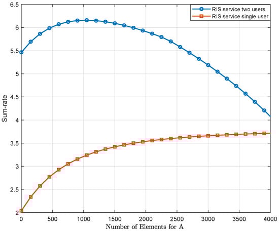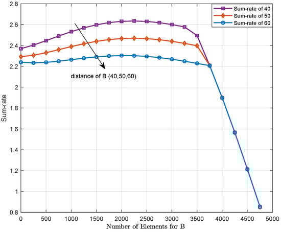 Figure 3 shows that the achievable capacity performs differently when user B experiences diverse channel conditions and user A is fixed. Assuming the distances from user S to B are 40, 50, and 60 m, it can be seen that the sum-rate first rises to a peak value and then drops rapidly with an increase in the number of RIS-allocated elements. The number of reflecting elements needed to obtain the equivalent transmission sum-rate gradually increases when the distance from user B to the source increases. Clearly, the rapid decrease in sum-rate after reaching the peak value is due to the minimum value for the SINR being changed by means of our proposed scheme, which is given as Equations (7) and (9). For example, when , as the elements number to service user B, increases, the channel quality of B is gradually better than A, and thus the minimum value in Equation (9) can be taken as , where the number of elements to service user B increases and the sum-rate decreases rapidly.